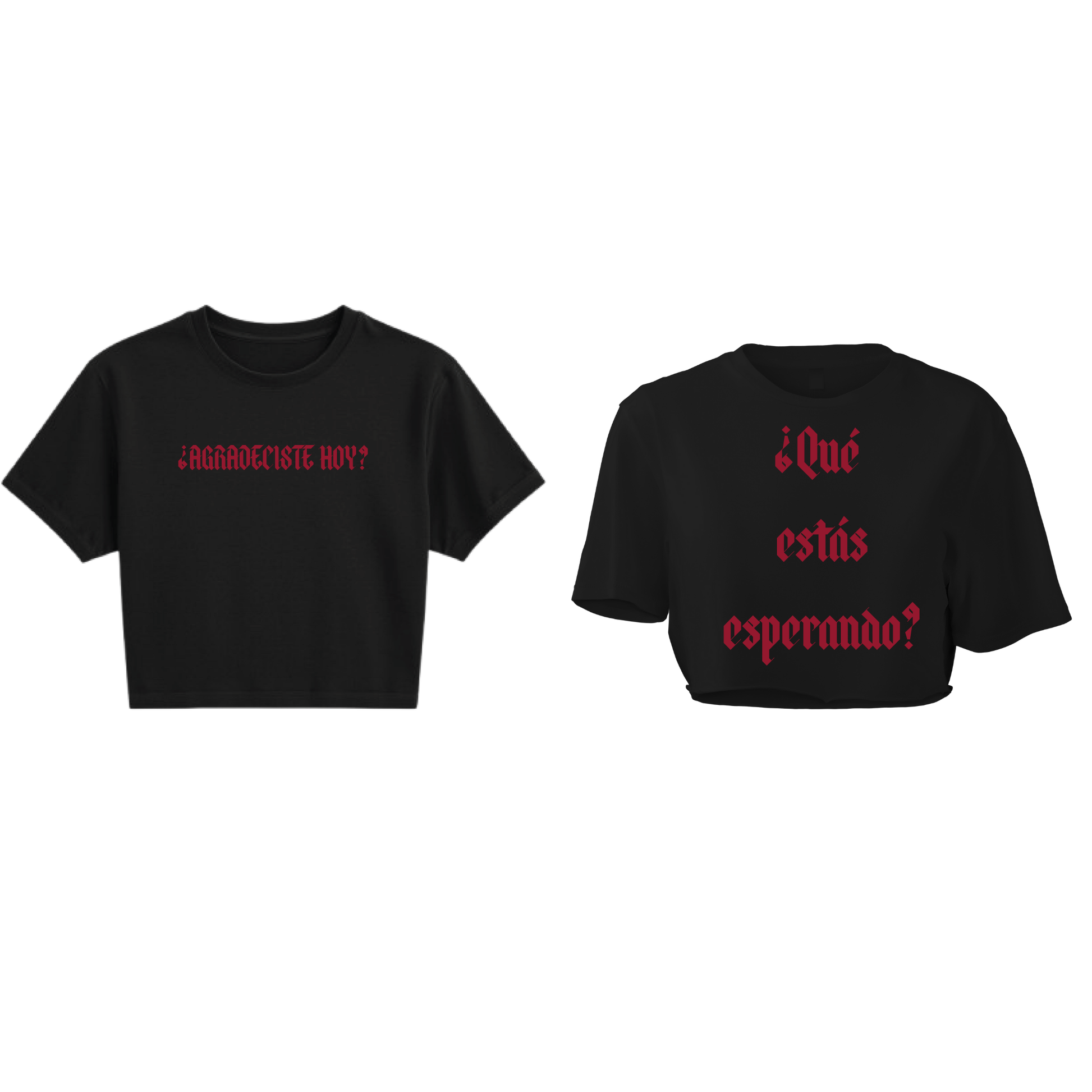 Croptop con diseño frontal y trasero que invita a la reflexión. Al frente lleva la frase “¿Agradeciste hoy?” y en la parte posterior “¿Qué estás esperando?”, recordándonos la importancia de practicar la gratitud cada día. Disponible en blanco y negro, es una prenda cómoda y con un mensaje poderoso para compartir.