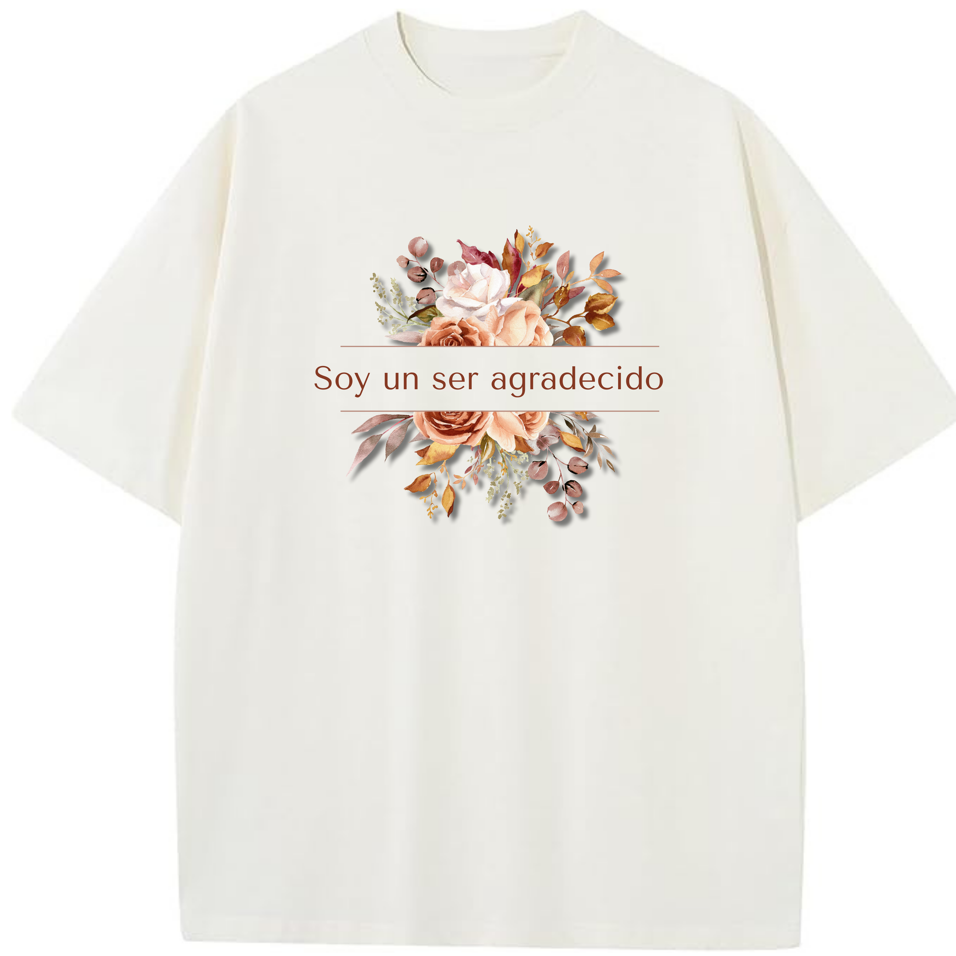 Camisa Unisex con diseño floral en tonos otoñales y el mensaje “Soy un ser agradecido”. Una prenda que combina estilo y significado, llevando contigo una afirmación necesaria que a diario debemos recordarnos: vivir con gratitud. Disponible en color negra o blanca.